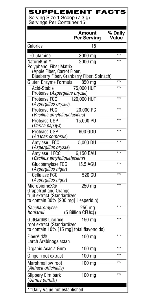 Glutamine directly supports gut health 3 ways: it aids the balance of the gut microbiome, increases tight junction proteins and the integrity of the intestinal lining, and helps to minimize the inflammatory response in situations of gut mucosal irritation.†
