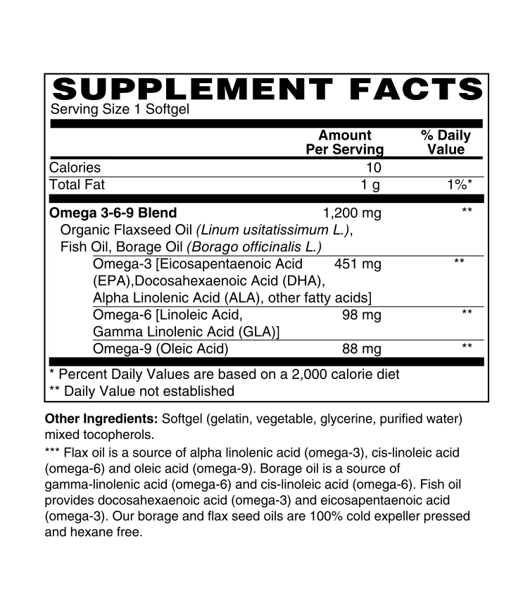 Omega 3,6,9 Complete EFA is a mixture of borage seed oil, flaxseed oil, and fish oil which provide both categories of essential fatty acids (omega-3 and 6) along with the benefits of the omega-9 fat oleic acid.