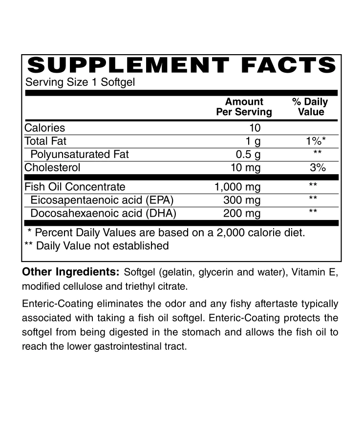 Enteric coating protects the softgel from the harsh environment of the stomach, and then travels to the small intestine where it is digested and its fatty acids released and absorbed into the body. This prevents a fishy aftertaste and odor, which is helpful to sensitive individuals.