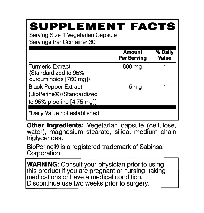 800 mg Turmeric per capsule(standardized to 95% curcuminoids[760 mg])