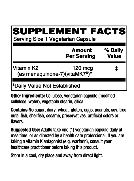 High Potency (120mcg) of vitaMK7® Menaquinone-7 is the most efficacious form of Vitamin K2 for bone and cardio health.